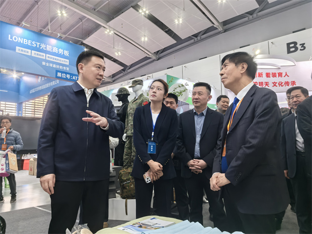 展會期間,教育部關心下一代工作委員會常務副主任王富,濱州市委常委、副市長屈躍寬等領導來到公司展位前參觀指導,詳細了解了產品的核心優勢和應用價值。領導們對公司在教育紡織品領域的創新能力和技術優勢給予了充分肯定,并對公司未來在教育領域的發展寄予厚望。